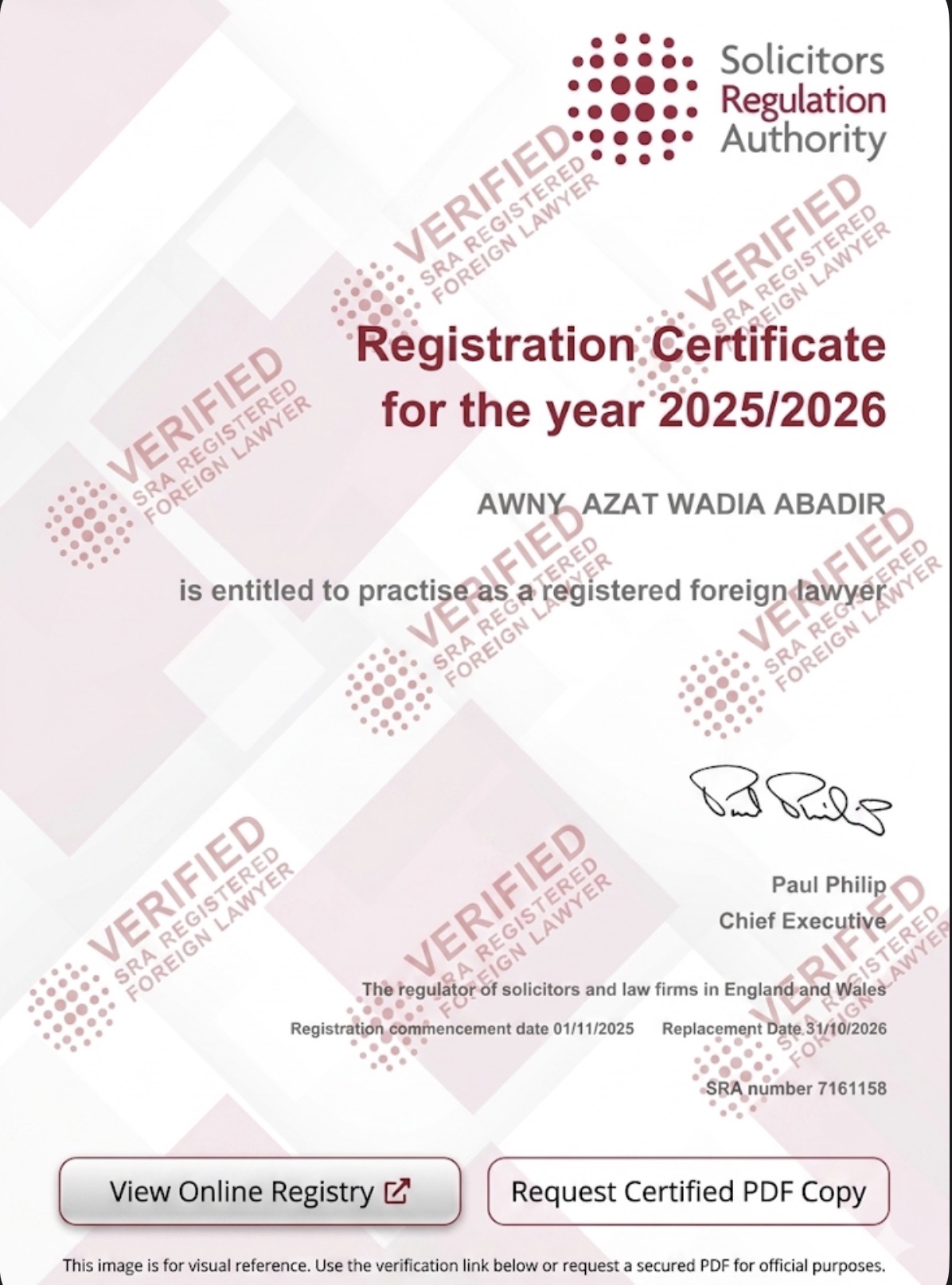 I am a Registered Foreign Lawyer (RFL), regulated by the Solicitors Regulation Authority (SRA) in England and Wales. I operate a fully digital legal practice, utilizing secure and encrypted platforms to provide legal consultancy and support services to solicitors, barristers, and private clients worldwide. This digital-first model ensures: