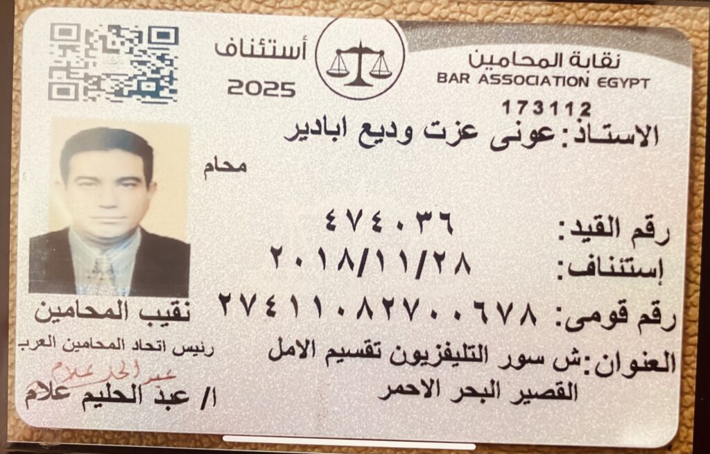 • جمهورية مصر العربية: محامٍ مقيد بجدول الاستئناف بنقابة المحامين المصرية (رقم القيد: 474036).